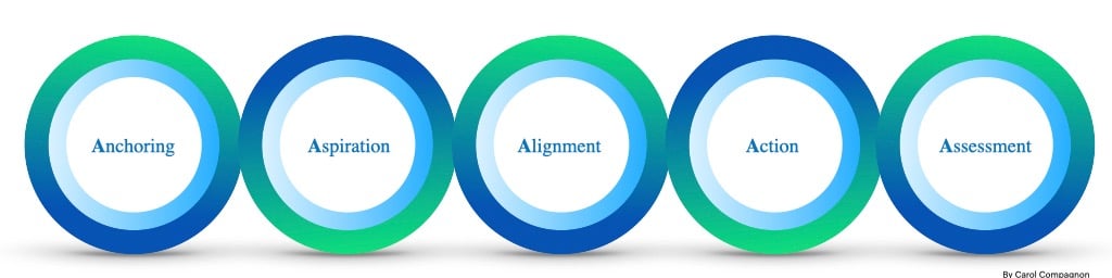 In my streamlining process, we navigate through five essential stages: Anchoring, Aspiration, Alignment, Action, and Assessment.